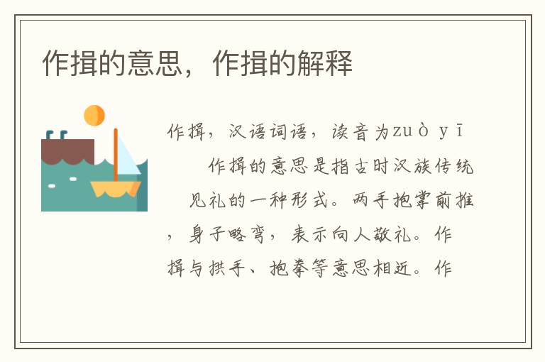 作揖,汉语词语,读音为zuò yī。作揖的意思是指古时汉族传统相见礼的一种形式。两手抱掌前推,身子略弯,表示向人敬礼。作揖与拱手、抱拳等意思相近。作揖比较正式,礼仪更隆重。而拱手、抱拳等更加口语化和随意化,比如拱手相让、抱拳示好等等。