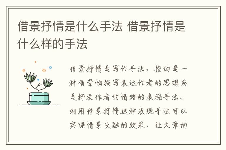 借景抒情是写作手法中的表现手法,指的是借景物描写表达作者的思想或是抒发作者的情绪的表现手法。利用借景抒情这种表现手法可以实现情景交融的效果,让文章的情感表达更加细腻深刻,也就是王国维说的“一切景语皆情语”。