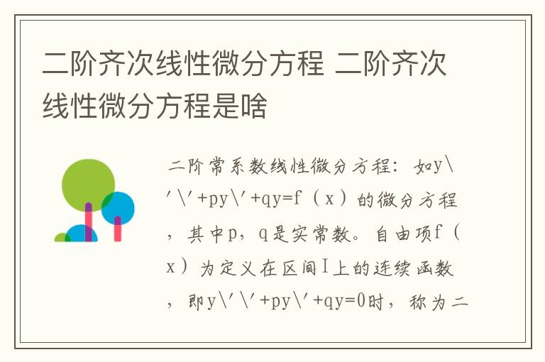 二阶常系数线性微分方程:如y''+py'+qy=f(x)的微分方程,其中p,q是实常数。自由项f(x)为定义在区间I上的连续函数,即y''+py'+qy=0时,称为二阶常系数齐次线性微分方程。