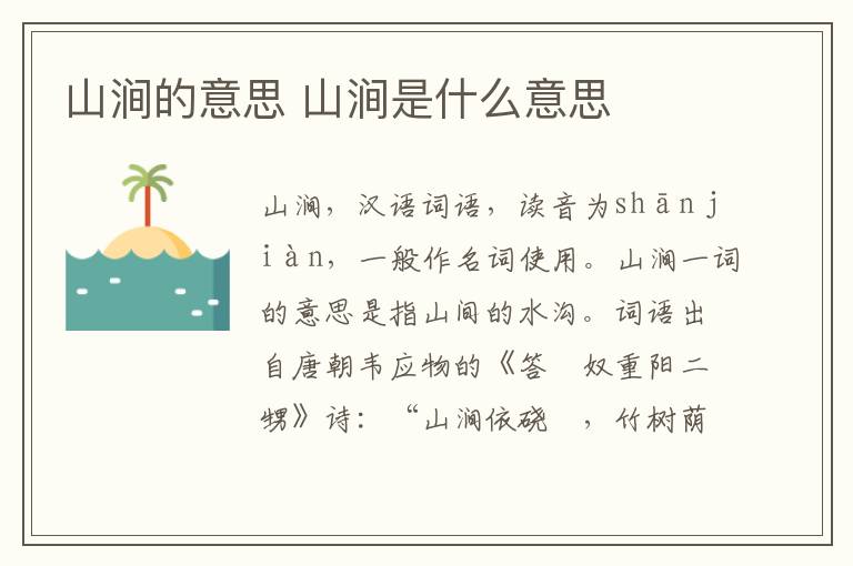 山涧的意思 山涧是什么意思 知识分享 24年12月25日 编辑 童画 取消关注 关注 私信 山涧,汉语词语,读音为shānjiàn,一般作名词使用。山涧一词的意思是指山间的水沟。词语出自唐朝韦应物的《答僴奴重阳二甥》诗:“山涧依硗塉,竹树荫清源。” 山涧的近义词有:山沟水沟峡谷 词语造句:可是夏季的炎热天气已经把所有的山涧小溪都晒干了。 融化的雪水,从高悬的山涧从峭壁断崖上飞泻下来,像千百条闪耀的银链。 No related posts. 本文内容由互联网用户自发贡献,该文观点仅代表作者本人。本站仅提供信息存储空间服务,不拥有所有权,不承担相关法律责任。如发现本站有涉嫌抄袭侵权/违法违规的内容, 请发送邮件至 2245678901@qq.com 举报,一经查实,本站将立刻删除。 给TA打赏 共{{data.count}}人 人已打赏