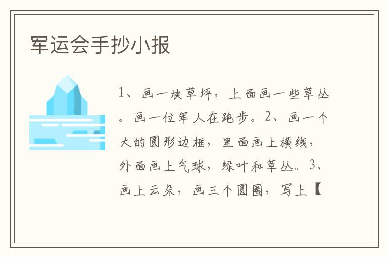军运会手抄小报 知识分享 24年12月19日 编辑 童画 取消关注 关注 私信 1、画一块草坪,上面画一些草丛。画一位军人在跑步。 2、画一个大的圆形边框,里面画上横线,外面画上气球,绿叶和草丛。 3、画上云朵,画三个圆圈,写上【军运会】,下面画上房子。 4、最后涂上颜色就可以啦。 No related posts. 本文内容由互联网用户自发贡献,该文观点仅代表作者本人。本站仅提供信息存储空间服务,不拥有所有权,不承担相关法律责任。如发现本站有涉嫌抄袭侵权/违法违规的内容, 请发送邮件至 2245678901@qq.com 举报,一经查实,本站将立刻删除。 给TA打赏 共{{data.count}}人 人已打赏
