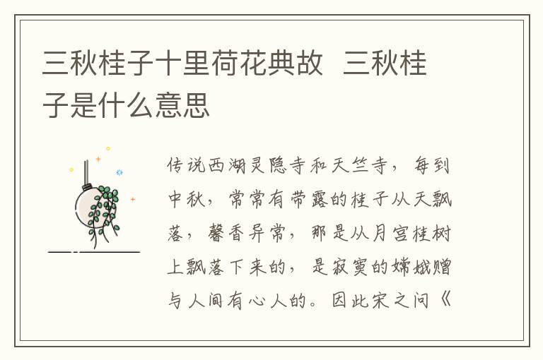 “三秋桂子”就让人联想起有关西湖的美丽传说,传说西湖灵隐寺和天竺寺,每到中秋,常常有带露的桂子从天飘落,馨香异常,那是从月宫桂树上飘落下来的,是寂寞的嫦娥赠与人间有心人的。因此宋之问《灵隐寺》中写道:“桂子月中落,天香云外飘。”白居易《忆江南》中也有“山寺月中寻桂子”。美丽的传说给秀丽的西湖增添了神秘空灵的色彩。