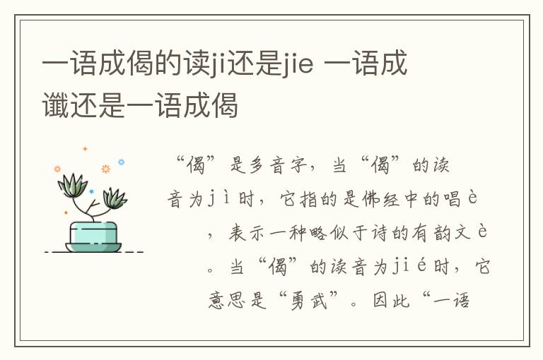 “偈”是多音字,当“偈”的读音为jì时,它指的是佛经中的唱词,表示一种略似于诗的有韵文辞。当“偈”的读音为jié时,它的意思是“勇武”。因此“一语成偈”中的“偈”应该读作jì。但是,“一语成偈”不是正确表达,这个成语的正确表达是“一语成谶”,它的意思是:戏言成真。
