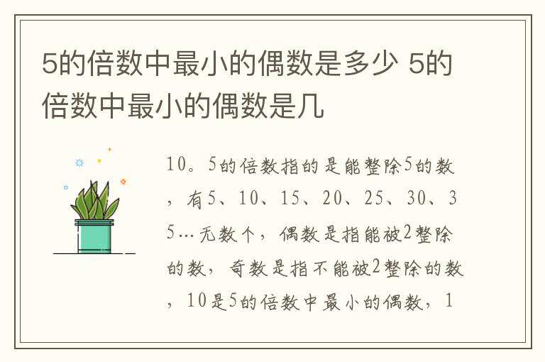 5的倍数中最小的偶数是多少 5的倍数中最小的偶数是几 知识分享 1月25日 编辑 童画 取消关注 关注 私信 5的倍数中最小的偶数是10。 5的倍数指的是能整除5的数,有5、10、15、20、25、30、35…无数个,偶数是指能被2整除的数,奇数是指不能被2整除的数,10是5的倍数中最小的偶数,15是5的倍数中最小的两位数奇数。 No related posts. 本文内容由互联网用户自发贡献,该文观点仅代表作者本人。本站仅提供信息存储空间服务,不拥有所有权,不承担相关法律责任。如发现本站有涉嫌抄袭侵权/违法违规的内容, 请发送邮件至 2245678901@qq.com 举报,一经查实,本站将立刻删除。 给TA打赏 共{{data.count}}人 人已打赏