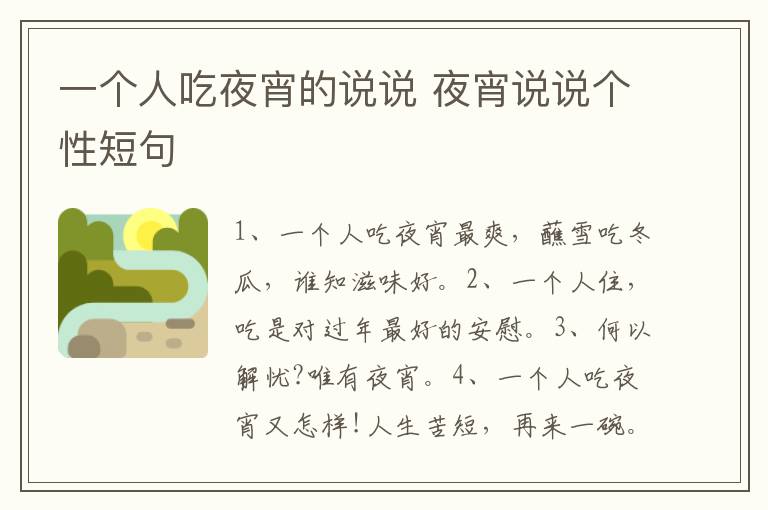 一个人吃夜宵的说说:1、一个人吃夜宵最爽,蘸雪吃冬瓜,谁知滋味好。2、一个人住,吃是对过年最好的安慰。3、何以解忧?唯有夜宵。4、一个人吃夜宵又怎样!人生苦短,再来一碗。