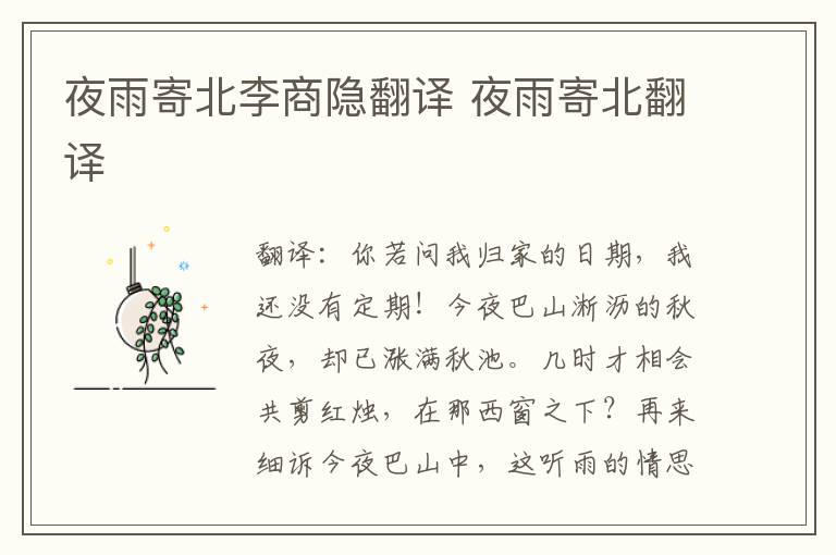翻译:你若问我归家的日期,我还没有定期!今夜巴山淅沥的秋夜,却已涨满秋池。几时才相会共剪红烛,在那西窗之下?再来细诉今夜巴山中,这听雨的情思。全诗表达了诗人对于归期难定的悲哀、大雨滂沱的悲凉、对妻子的深深思念、幻想团聚的快乐等情感。