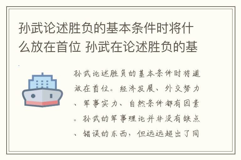孙武论述胜负的基本条件时将道放在首位。经济发展、外交努力、军事实力、自然条件都有因素。孙武的军事理论并非没有缺点、错误的东西,但远远超出了同时代的兵法著作,也以其卓越的见识深深影响了后世,受到古今中外军事家的广泛推崇。