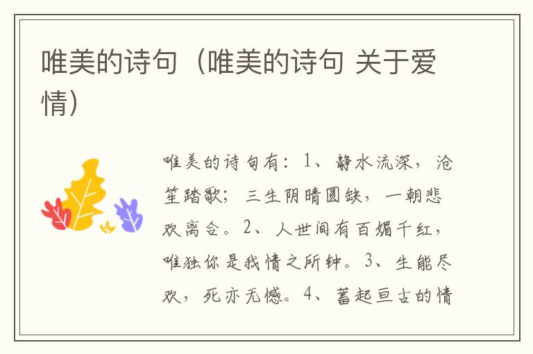 唯美的诗句有:1、静水流深,沧笙踏歌;三生阴晴圆缺,一朝悲欢离合。2、人世间有百媚千红,唯独你是我情之所钟。3、生能尽欢,死亦无憾。4、蓄起亘古的情丝,揉碎殷红的相思。5、灯火星星,人声杳杳,歌不尽乱世烽火。6、用我三生烟火,换你一世迷离。7、我自是年少,韶华倾负。8、长街长,烟花繁,你挑灯回看。