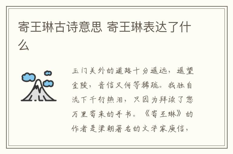 《寄王琳》的译文:玉门关外的道路十分遥远,遥望金陵,音信又何等稀疏。我独自流下千行热泪,只因为拜读了您万里寄来的手书。《寄王琳》的作者是梁朝著名的文学家庾信,这首诗写于庾信在北方收到王琳寄给他的信之后。