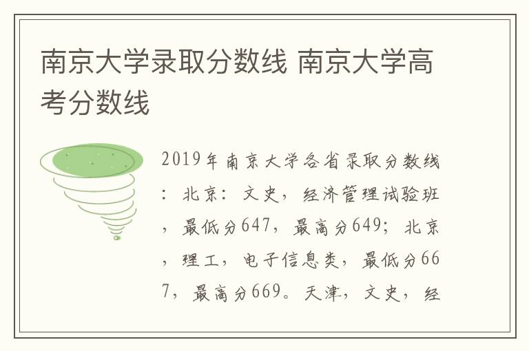 2019年南京大学各省录取分数线:北京:文史,经济管理试验班,最低分647,最高分649;北京,理工,电子信息类,最低分667,最高分669。天津,文史,经济管理试验班,最低分630,最高分634;天津,理工,电子信息类,最低分684,最高分685。