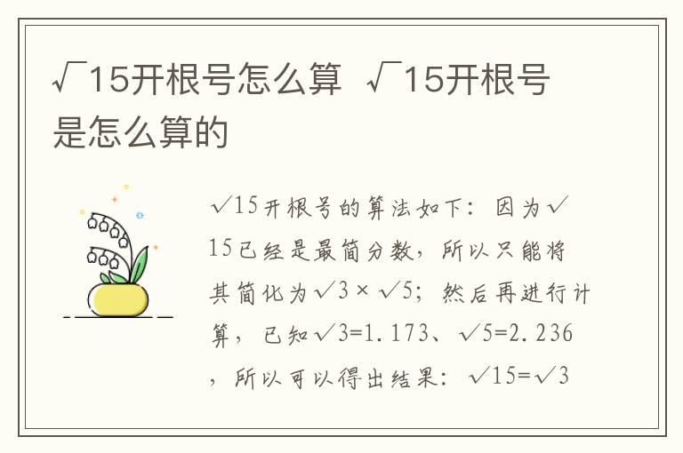 √15开根号的算法是先把√15进行简化,因为15这个数字不能完全被化简,所以只能将其简化为3×5,因此√15的简化为√3×√5,然后再进行计算,因为√3=1.173、√5=2.236,所以得出结果√15=√3×√5=1.173×2.236≈3.87。