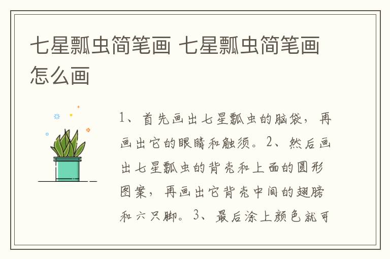 七星瓢虫简笔画 七星瓢虫简笔画怎么画简单又漂亮 知识分享 4月26日 编辑 童画 取消关注 关注 私信 1、首先画出七星瓢虫的脑袋,再画出它的眼睛和触须。 2、然后画出七星瓢虫的背壳和上面的圆形图案,再画出它背壳中间的翅膀和六只脚。 3、最后涂上颜色就可以了。 No related posts. 本文内容由互联网用户自发贡献,该文观点仅代表作者本人。本站仅提供信息存储空间服务,不拥有所有权,不承担相关法律责任。如发现本站有涉嫌抄袭侵权/违法违规的内容, 请发送邮件至 2245678901@qq.com 举报,一经查实,本站将立刻删除。 给TA打赏 共{{data.count}}人 人已打赏