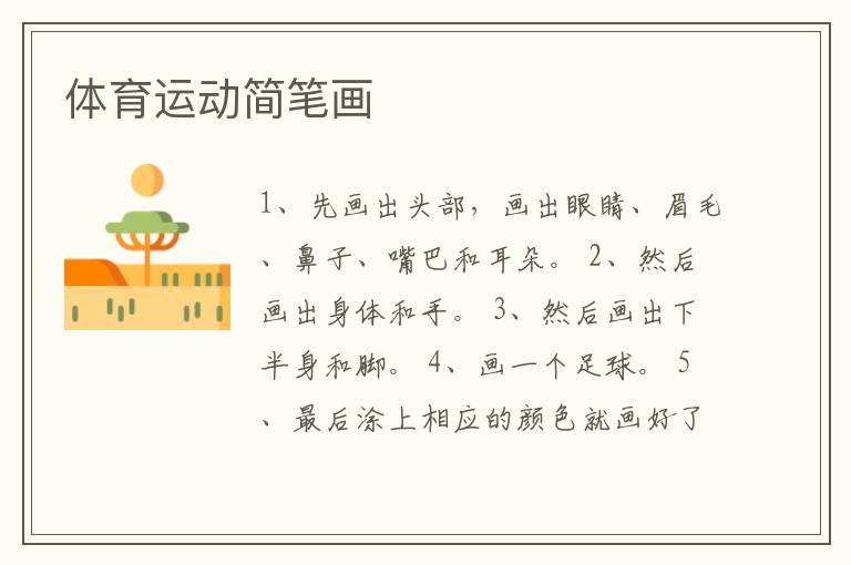 体育运动简笔画 知识分享 4月26日 编辑 童画 取消关注 关注 私信 1、先画出头部,画出眼睛、眉毛、鼻子、嘴巴和耳朵。 2、然后画出身体和手。 3、然后画出下半身和脚。 4、画一个足球。 5、最后涂上相应的颜色就画好了。 No related posts. 本文内容由互联网用户自发贡献,该文观点仅代表作者本人。本站仅提供信息存储空间服务,不拥有所有权,不承担相关法律责任。如发现本站有涉嫌抄袭侵权/违法违规的内容, 请发送邮件至 2245678901@qq.com 举报,一经查实,本站将立刻删除。 给TA打赏 共{{data.count}}人 人已打赏