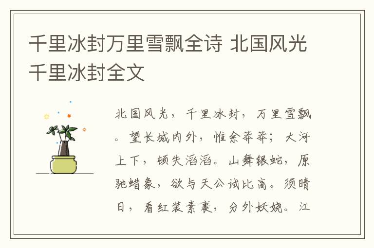 北国风光,千里冰封,万里雪飘。望长城内外,惟余莽莽;大河上下,顿失滔滔。山舞银蛇,原驰蜡象,欲与天公试比高。须晴日,看红装素裹,分外妖娆。江山如此多娇,引无数英雄竞折腰。惜秦皇汉武,略输文采;唐宗宋祖,稍逊风骚。一代天骄,成吉思汗,只识弯弓射大雕。俱往矣,数风流人物,还看今朝。