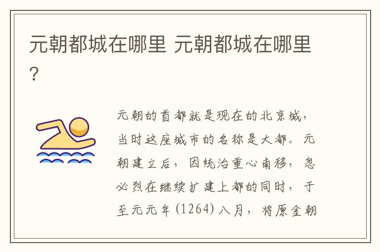 元朝的首都就是现在的北京城,当时这座城市的名称是大都。元朝建立后,因统治重心南移,忽必烈在继续扩建上都的同时,于至元元年(1264)八月,将原金朝首都燕京定名为中都,开始正式确立两都巡幸制度。至元四年,因中都旧城残破不堪,忽必烈决定在中都的东北建筑新城,至元九年二月,改中都名为大都。