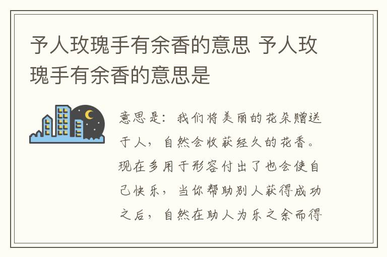 予人玫瑰手有余香的意思是我们将美丽的花朵赠送于人,自然会收获经久的花香。多用于形容付出了也会使自己快乐,当你帮助别人获得成功之后,自然在助人为乐之余而得到回馈。出自印度古谚:赠人玫瑰之手,经久犹有余香。