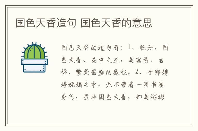 国色天香的造句有:1、牡丹,国色天香、花中之王,是富贵、吉祥、繁荣昌盛的象征。2、于那娉婷妩媚之中,无不带着一团书卷秀气,虽非国色天香,却是彬彬儒雅。3、他不是个美男子,她也不是国色天香。