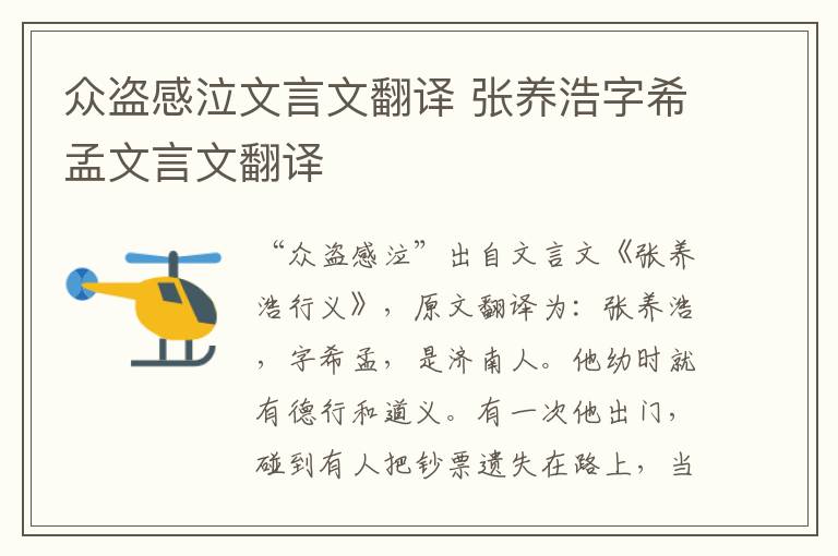 “众盗感泣”出自文言文《张养浩行义》,原文翻译为:张养浩,字希孟,是济南人。他幼时就有德行和道义。有一次他出门,碰到有人把钞票遗失在路上,当张养浩发现的时候,那个人已经走了,张养浩就追上去把钱还给他。