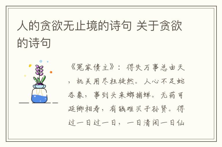 《冤家债主》:得失万事总由天,机关用尽枉徒然。人心不足蛇吞象,事到头来螂捕蝉。无药可延卿相寿,有钱难买子孙贤。得过一日过一日,一日清闲一日仙。这是诗的译文就是说万事的成功和失败都是由天注定,千方百计绞尽脑汁都没有用。官位再高、钱财再多也不能延长寿命,只有子孙贤慧孝顺难能可贵。
