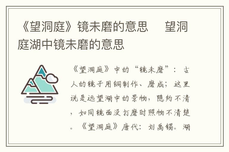 《望洞庭》中的“镜未磨”:古人的镜子用铜制作、磨成;这里说是远望湖中的景物,隐约不清,如同镜面没打磨时照物不清楚。《望洞庭》唐代:刘禹锡。湖光秋月两相和,潭面无风镜未磨。遥望洞庭山水翠,白银盘里一青螺。译文:风静浪息,月光和水色交融在一起,湖面就像不用磨拭的铜镜,平滑光亮。遥望洞庭,山青水绿,林木葱茏的洞庭山耸立在泛着白光的洞庭湖里,就像白银盘里的一只青螺。