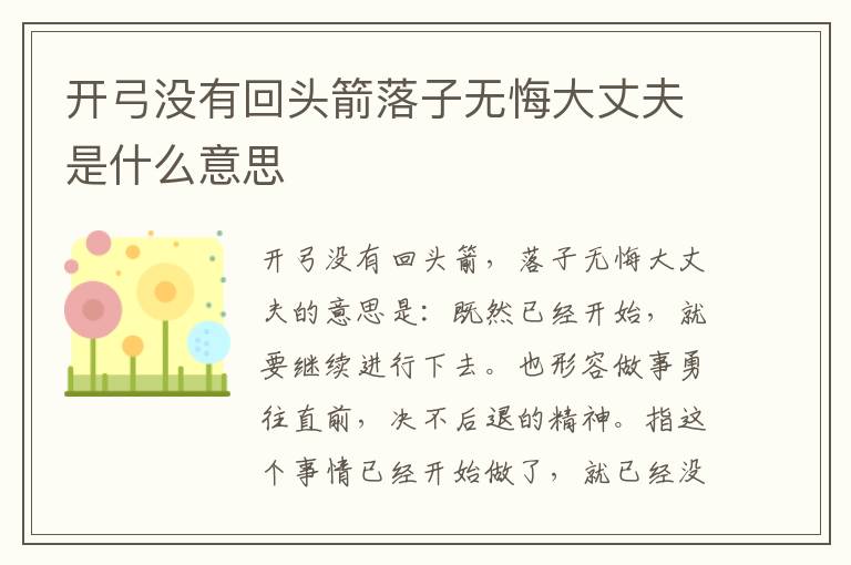 开弓没有回头箭落子无悔大丈夫的意思是:既然已经开始,就要继续进行下去。也形容做事勇往直前,决不后退的精神。指这个事情已经开始做了,就已经没有回头的余地了,就算是回头也会带同样大的损失,还不如拼死前进,无论胜败,不去回头。开弓:拉开了弓,射出了箭。