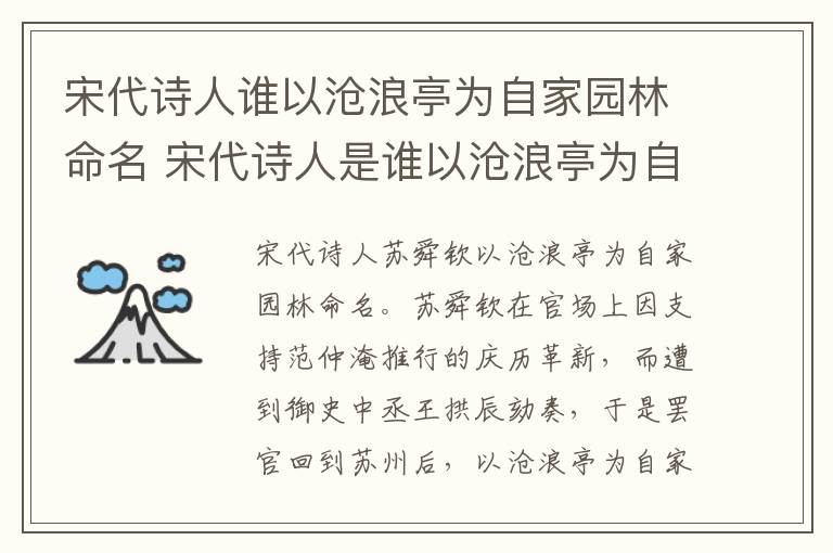 宋代诗人苏舜钦以沧浪亭为自家园林命名。苏舜钦在官场上因支持范仲淹推行的庆历革新,而遭到御史中丞王拱辰劾奏,于是罢官回到苏州后,以沧浪亭为自家园林命名,来表现自己对人生宠辱不惊的态度。在庆历八年复官为湖州长史,未及赴任即病逝。卒时年仅四十一岁。