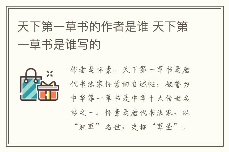 作者是怀素。天下第一草书是唐代书法家怀素的自述帖,被誉为中华第一草书是中华十大传世名帖之一。怀素是唐代书法家,以“狂草”名世,史称“草圣”。俗姓钱,字藏真,永州零陵人。怀素出家为僧,经禅之暇,爱好书法,与张旭齐名,合称“颠张狂素”,形成唐代书法双峰并峙的局面,也是中国草书史上两座高峰。