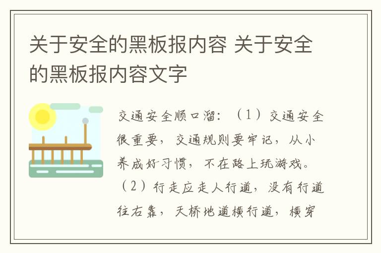 交通安全顺口溜:(1)交通安全很重要,交通规则要牢记,从小养成好习惯,不在路上玩游戏。(2)行走应走人行道,没有行道往右靠,天桥地道横行道,横穿马路不能做。(3)一慢二看三通过,莫与车辆去抢道。骑车更要守规则,不能心急闯红灯(4)乘车安全要注意,遵守秩序要排队;手头不能伸窗外,扶紧把手莫忘记。