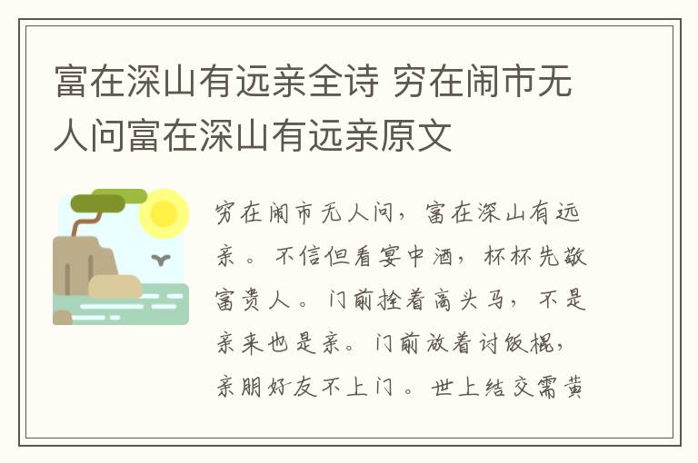 穷在闹市无人问,富在深山有远亲 。不信但看宴中酒,杯杯先敬富贵人 。门前拴着高头马,不是亲来也是亲。门前放着讨饭棍,亲朋好友不上门