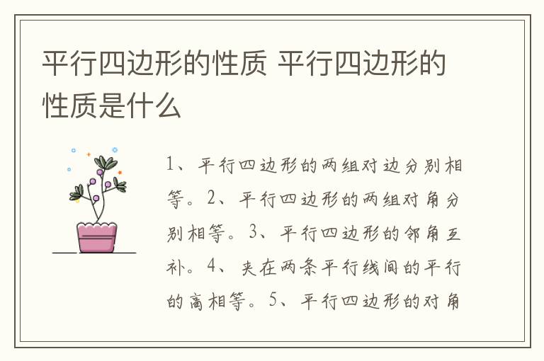 平行四边形是在同一个二维平面内,由两组平行线段组成的闭合图形。它的性质有: