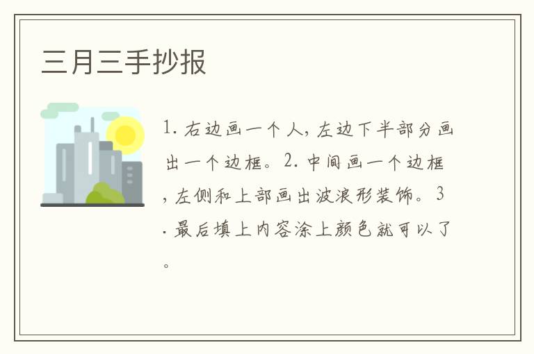 三月三手抄报 知识分享 24年12月19日 编辑 童画 取消关注 关注 私信 1.右边画一个人,左边下半部分画出一个边框。 2.中间画一个边框,左侧和上部画出波浪形装饰。 3.最后填上内容涂上颜色就可以了。 No related posts. 本文内容由互联网用户自发贡献,该文观点仅代表作者本人。本站仅提供信息存储空间服务,不拥有所有权,不承担相关法律责任。如发现本站有涉嫌抄袭侵权/违法违规的内容, 请发送邮件至 2245678901@qq.com 举报,一经查实,本站将立刻删除。 给TA打赏 共{{data.count}}人 人已打赏