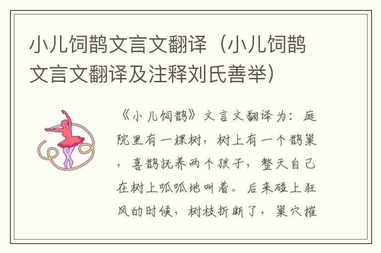 《小儿饲鹊》文言文翻译为:庭院里有一棵树,树上有一个鹊巢,喜鹊抚养两个孩子,整天自己在树上呱呱地叫着。后来碰上狂风的时候,树枝折断了,巢穴摧毁了,两只小喜鹊掉在了地上。一个小孩看见了,非常高兴,把小鸟抱在怀里回了家,每天早晚,都在喂养它们,非常喜爱它们。
