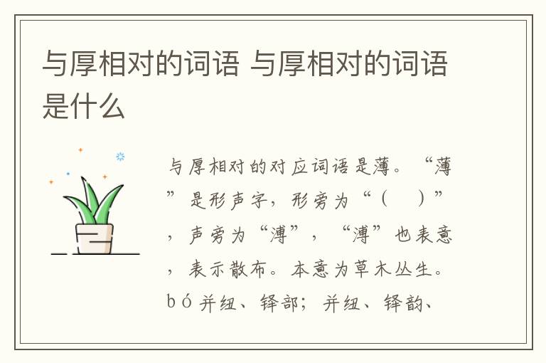 与厚相对的对应词语是薄。“薄”是形声字,形旁为“(艸)”,声旁为“溥”,“溥”也表意,表示散布。本意为草木丛生。bó并纽、铎部;并纽、铎韵、傍各切。形声字。从艸,溥声。本义是指草木密集丛生之处。《说文》:“薄,林薄也。”段玉裁注:“《吴都赋》:‘倾薮薄。’刘注曰:‘薄,不入之丛也。’按,林木相迫不可入曰薄。”