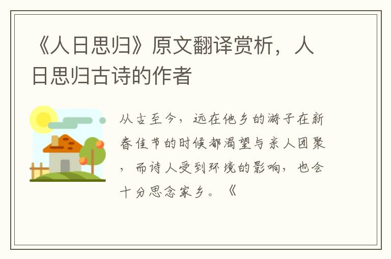 从古至今,远在他乡的游子在新春佳节的时候都渴望与亲人团聚,而诗人受到环境的影响,也会十分思念家乡。《人日思归》也表达了作者的思乡之情,今天就让我们一起来赏析一下这首诗吧。