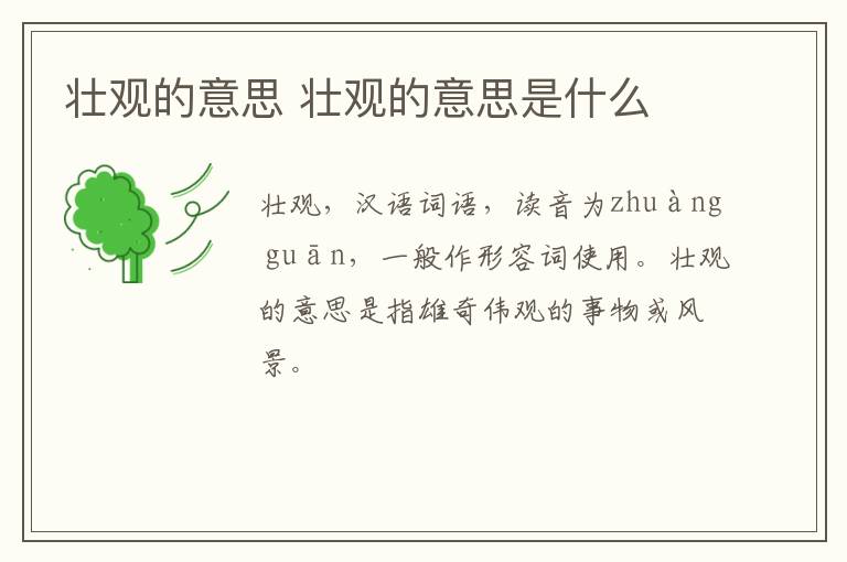 壮观,汉语词语,读音为zhuàngguān,一般作形容词使用。壮观的意思是指雄奇伟观的事物或风景。词语出自司马相如《封禅文》:“故圣王不替,而修礼地祇,谒款天神,勒功中岳,以章至尊,舒盛德,发号荣,受厚福,以浸黎元,皇皇哉,此天下之壮观,王者之卒业,不可贬也。”