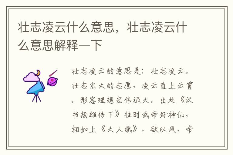 壮志凌云的意思是:壮志凌云。壮志宏大的志愿,凌云直上云霄。形容理想宏伟远大。出处《汉书扬雄传下》往时武帝好神仙,相如上《大人赋》,欲以风,帝反缥缥有凌云之志。反义词是好逸恶劳、无所作为、暮气沉沉、垂头丧气、人穷志短、无所事事。