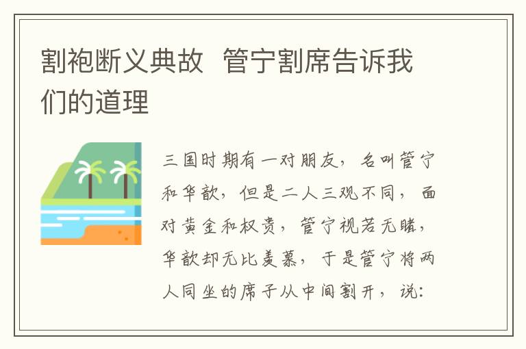 三国时期魏国的一个饱学之士管宁和好朋友华歆共园中锄菜,华歆管宁两个,在园中锄菜,菜地里头竟有一块前人埋藏的黄金,黄金就被管宁的锄头翻腾出来了。但是华歆管宁他们平时读书养性,就是要摒出人性中的贪念,所以这时候,管宁见了黄金,就把它当做了砖石土块对待,用锄头一拨就扔到一边了。华歆在后边锄,过了一刻也见了,明知道这东西不该拿,但心里头不忍,还是拿起来看了看才扔掉。这件事说明,华歆的修为和管宁比要差着一截。过了几天,两人正在屋里读书,外头的街上有达官贵人经过,乘着华丽的车马,敲锣打鼓的,很热闹。管宁还是和没听见一样,继续认真读他的书。华歆却坐不住了,跑到门口观看,对这达官的威仪艳羡不已。车马过去之后,华歆回到屋里,管宁却拿了一把刀子,将两人同坐的席子从中间割开,说:“你呀,不配再做我的朋友啦!”这个故事也就是后人割袍断义和划地断义的原型。表示两个至交好友或者同胞兄弟划清界限,不再为伍。