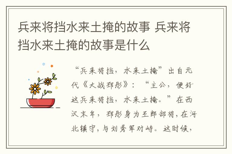 “兵来将挡,水来土掩”出自元代《大战邳彤》:“主公,便好这兵来将挡,水来土掩。”在西汉末年,邳彤身为王郎部将,在河北镇守,与刘秀军对峙。这时候,刘秀听从邓禹的计策,命令铫期为先锋,出战邳彤,静候将邳彤其生擒,河北归为刘秀所有。