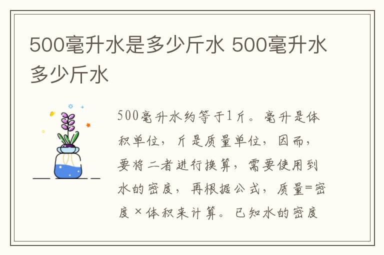 500毫升水约等于1斤。毫升是体积单位,斤是质量单位,因而,要将二者进行换算,需要使用到水的密度,再根据公式,质量=密度×体积来计算。已知水的密度:1克/立方厘米=1克/毫升。计算时使用到500ml。所以,根据公式得到,500ml水的质量是:1克/毫升×500毫升=500克,即1斤。