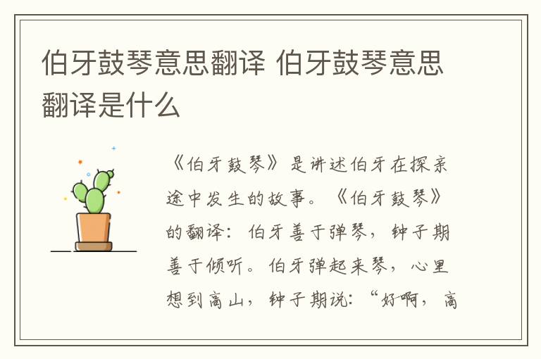 《伯牙鼓琴》是讲述伯牙在探亲途中发生的故事。《伯牙鼓琴》的翻译:伯牙善于弹琴,钟子期善于倾听。伯牙弹起来琴,心里想到高山,钟子期说:“好啊,高峻的样子好像泰山!”心里又想到流水,钟子期说:“好啊,汹涌的样子好像江河!”不管伯牙心里想什么,钟子期都能准确地道出他的心意。子期死后,伯牙认为这世上再也没有知音了,于是就把琴摔碎,终生不再弹琴。