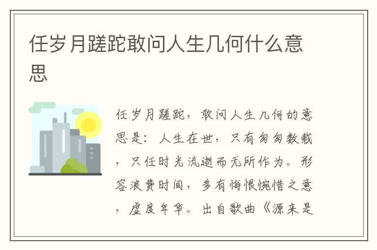 任岁月蹉跎,敢问人生几何的意思是:人生在世,只有匆匆数载,只任时光流逝而无所作为。形容浪费时间,多有悔恨惋惜之意,虚度年华。出自歌曲《源来是我》的歌词:任岁月蹉跎敢问人生几何,不知天高地厚我一生洒脱,自由自在是真我本色,再苦再难我一笑而过。