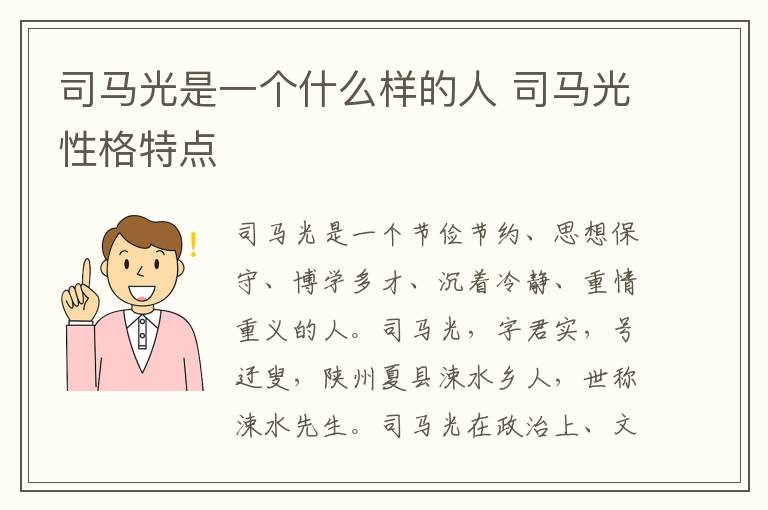 司马光是一个节俭节约、思想保守、博学多才、沉着冷静、重情重义的人。司马光,字君实,号迂叟,陕州夏县涑水乡人,世称涑水先生。司马光在政治上、文学上、史学上都有所成就,本人自然有大才。而这份才干和聪慧,早在小的时候就显现出来了,所以才有了司马光砸缸的故事。