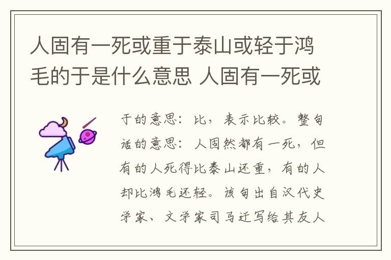 于的意思:比,表示比较。整句话的意思:人固然都有一死,但有的人死得比泰山还重,有的人却比鸿毛还轻。该句出自汉代史学家、文学家司马迁写给其友人任安的回信《报任安书》,作者在信中以激愤的心情,饱满的感情,陈述了自己的不幸遭遇,抒发了为著作《史记》而不得不含垢忍辱苟且偷生的痛苦心情。