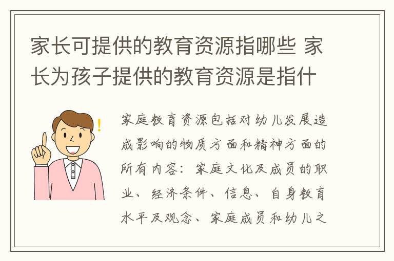 家庭教育资源包括对幼儿发展造成影响的物质方面和精神方面的所有内容:家庭文化及成员的职业、经济条件、信息、自身教育水平及观念、家庭成员和幼儿之间的沟通与交流、家长对幼儿的具体指导、教养方式等。