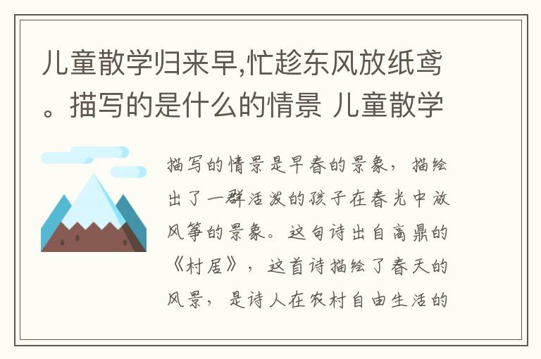 “儿童散学归来早,忙趁东风放纸鸢”。描写的情景是早春的景象,描绘出了一群活泼的孩子在春光中放风筝的景象。