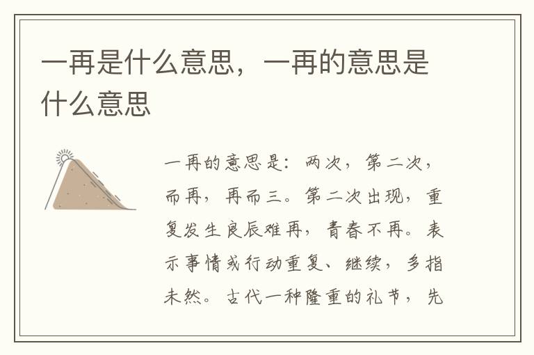一再的意思是:两次,第二次,而再,再而三。第二次出现,重复发生:良辰难再,青春不再。表示事情或行动重复、继续,多指未然。古代一种隆重的礼节,先后拜两次,表示郑重奉上的意思。再提升古代升降官职都称为迁。再次结婚古代男女婚嫁时父母为他们举行酌酒祭神的仪式叫醮,指妇女再嫁。