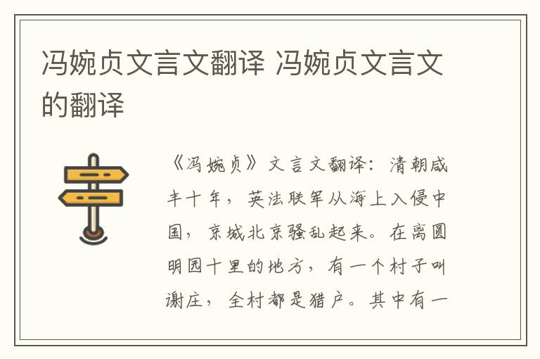 《冯婉贞》文言文翻译:清朝咸丰十年,英法联军从海上入侵中国,京城北京骚乱起来。在离圆明园十里的地方,有一个村子叫谢庄,全村都是猎户。其中有一个叫冯三保的,山东籍人,精通武术。他的女儿婉贞,十九岁,姿态优美容貌漂亮,从小喜爱武术,学习过的没有不精通的。这一年谢庄创办村民自卫组织“团练”,因为冯三保勇敢而又会多种武艺,大家推选他当头领。村民们在险要的地方筑起石墙、土堡垒等防御工事,树立起旗帜,上面写有“谢庄团练冯”几个大字。