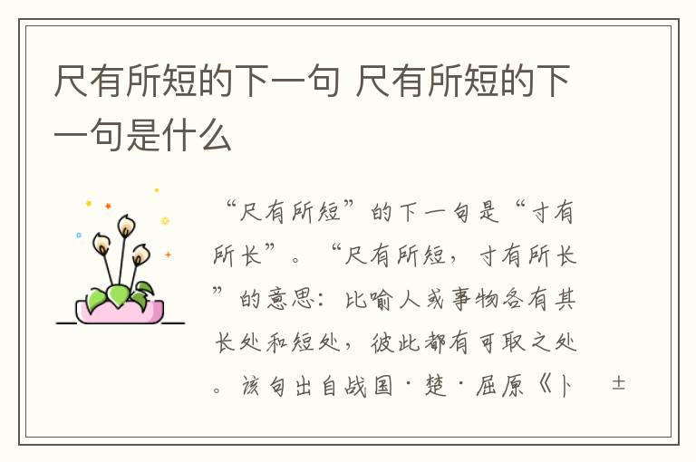 “尺有所短”的下一句是“寸有所长”。“尺有所短,寸有所长”的意思:比喻人或事物各有其长处和短处,彼此都有可取之处。该句出自战国·楚·屈原《卜居》。