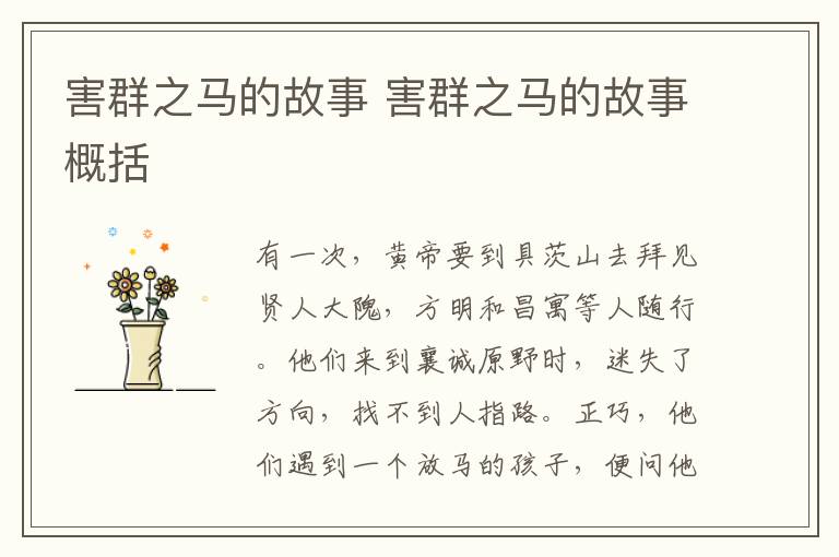 有一次,黄帝要到具茨山去拜见贤人大隗,方明和昌寓等人随行。他们来到襄诚原野时,迷失了方向,找不到人指路。正巧,他们遇到一个放马的孩子,便问他大隗住在哪里,孩子回答说:”知道。“黄帝说:“这孩子真特别!他知道大隗住在哪里。那么请问,你是否知道如何治理天下呢?”