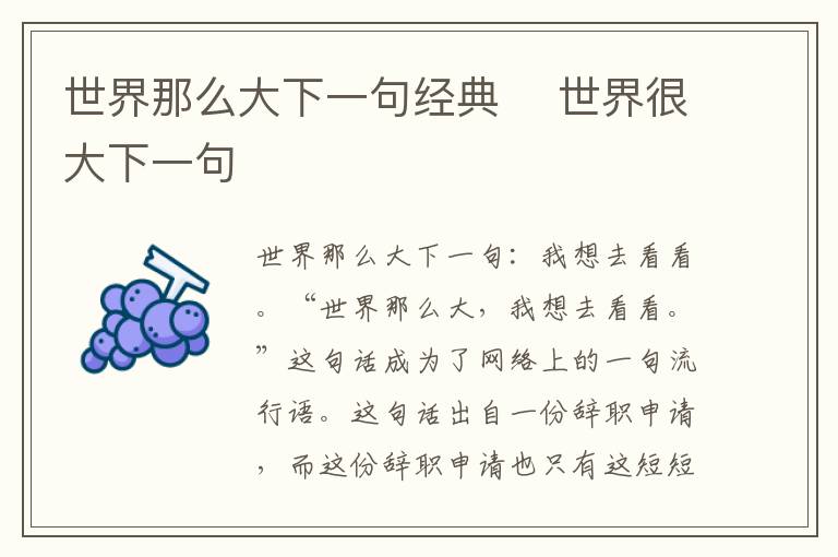 世界那么大下一句:我想去看看。“世界那么大,我想去看看。”这句话成为了网络上的一句流行语。这句话出自一份辞职申请,而这份辞职申请也只有这短短的10个字。这份印有“河南省实验中学信笺”抬头的辞职申请一被发到网上,就引来了网友们的热议。大家都评论说“这绝对是史上最具情怀的辞职申请”。“世界那么大,我想去看看”,也是一种勇气。尽情释放自我生命的激情,追逐新的体验,想到就要做到。